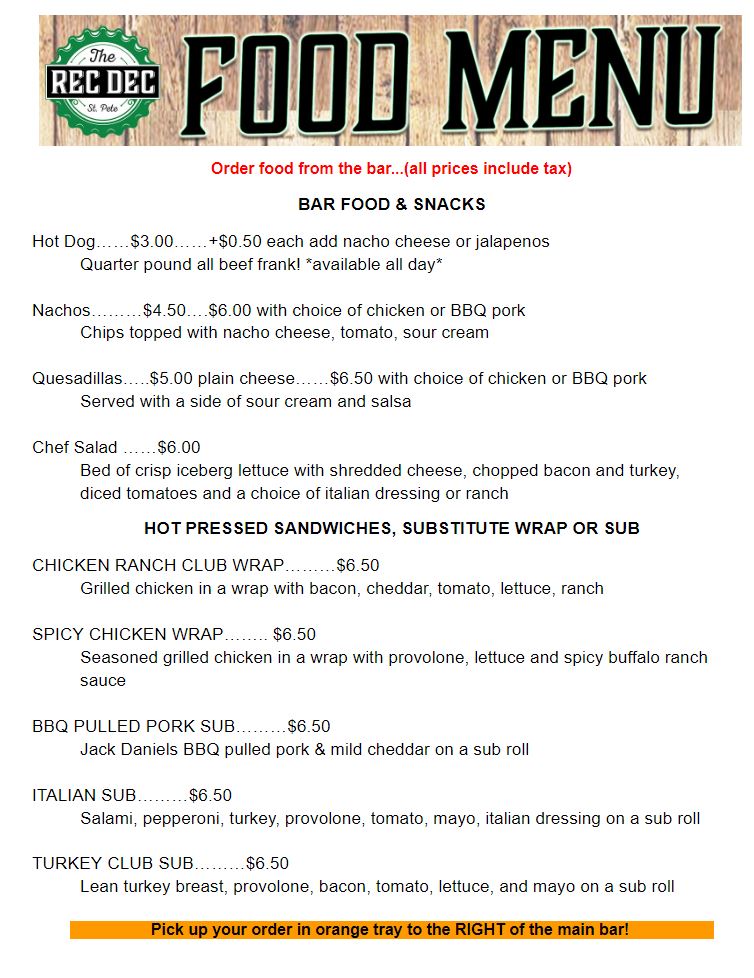 At Rec Dec, located in St. Petersburg, FL, the menu is a vibrant celebration of casual bar fare that complements an active lifestyle. Among the offerings, you’ll find satisfying Bar Food & Snacks like crunchy nachos and hearty chef salads, perfect for refueling post-game. If you’re in the mood for something more substantial, the array of subs—including the BBQ Pulled Pork Sub and the delightful Chicken Ranch Club Wrap—provide a delicious indulgence.